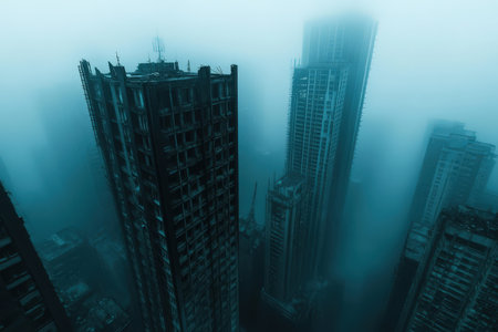 Tall skyscrapers loom in a dense fog, creating a surreal cityscape at dawn.