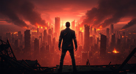 A lone wanderer stands in the foreboding glow of a dystopian dawn, overlooking a landscape scarred by disaster. The haunting beauty of the scene highlights the stark reality of a changed world