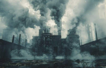Thick clouds of smoke billow from factory chimneys, obscuring a large industrial complex. The air is heavy with pollution, creating a dense and ominous atmosphere.