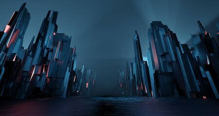 Sci-fi dark landscape metal block fantastic street house light by blue neon glow. Surreal alien city concept. 3D rendering