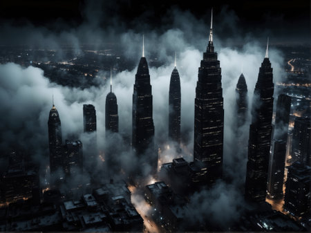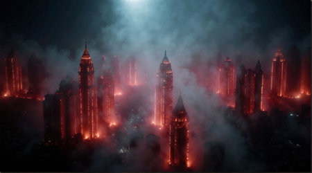 A city skyline with smoke billowing from the tops of the buildings. The smoke is thick and dark, creating a mood of despair and hopelessness. The city appears to be in the midst of a crisis
