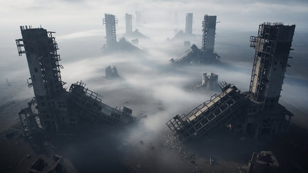 An aerial view of a desolate, post-apocalyptic cityscape filled with collapsed concrete buildings partially obscured by thick, eerie fog.
