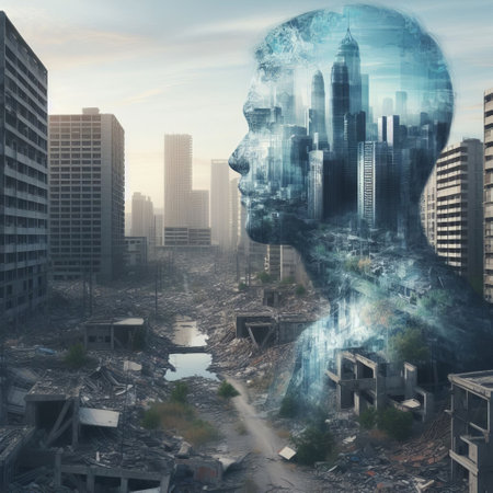 A thought-provoking composite image showing a human silhouette overlaid with a futuristic cityscape amidst ruins, suggesting deep themes of civilization and identity.. AI Generation