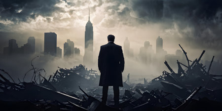 Silhouette of a person standing on debris, facing a foggy cityscape, evoking a sense of isolation and desolation
