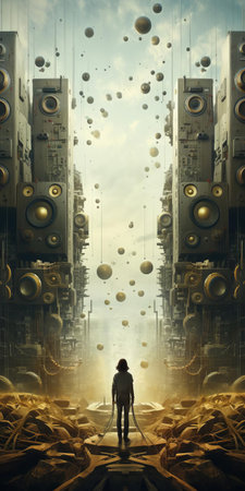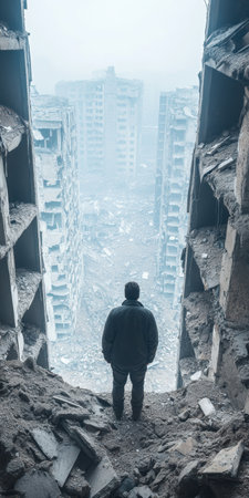 A lone individual stands in the remnants of an urban wasteland, the scene portraying a stark post-apocalyptic reality. The mood is somber and thought-provoking