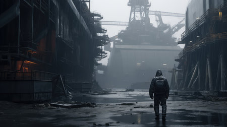A person walking down a muddy road in front of a factory. Generative AI image.