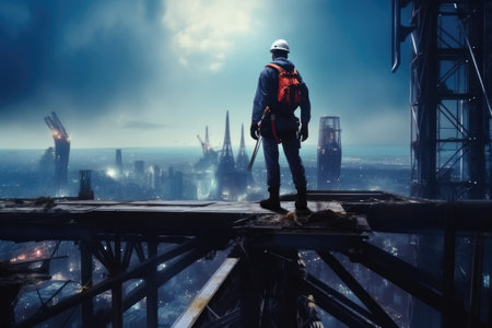 man stands atop crumbling skyscraper, digital art illustration, Generative AI