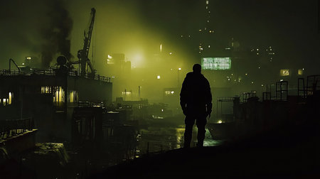A lone figure stands silhouetted against a foggy, industrial harbor at night, with cranes, buildings, and water reflecting the eerie yellow light. A sense of mystery and isolation pervades.