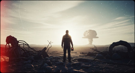 Lone Figure with Geiger Counter Facing Nuclear Mushroom Cloud