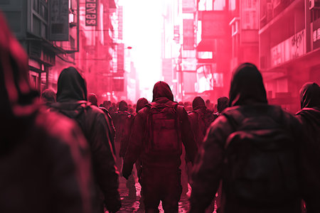 Transport the viewer into a dystopian reality by capturing a group of shadowy figures in gas masks, framed from a low angle against a backdrop of crumbling infrastructure Convey the uncertainty and tension of a bleak future