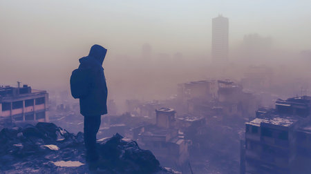 Silhouette of a person standing on debris, facing a foggy cityscape, evoking a sense of isolation and desolation