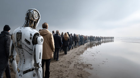 A striking image featuring a futuristic robot observing a long line of people along a beach under a dramatic, overcast sky. The scene evokes emotions of solitude and reflection, illustrating the intersection of technology and humanity.