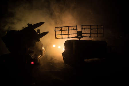 Creative artwork decoration. Silhouette of mobile air defense truck with radar antenna at night. Rocket launcher aimed at sky ready to attack. Selective focus