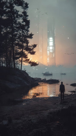 a black and blue image of a mist-covered factory with a road in the background. this atmospheric horizon scene, reminiscent of shwedoff's style, showcases a blend of light maroon and green tones. captured in stunning 8k resolution, the image exudes a sense of mystery and intrigue, reminiscent of the works of daz3d and even mehl amundsen. ai generated
