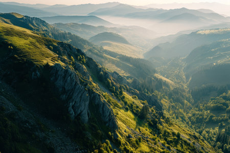 Abstract mountain background - concept of tourism and mountaineering. Layers of ridges in Carpathians Mountains Ukraine at sanrise sky