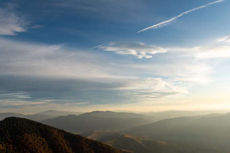 Beautiful sunset and layered mountain silhouettes in evening. Autumn in mountain, amazing landscape