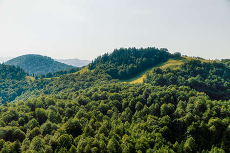 Bewitching beautiful summer landscape of a green meadow on a hill overlooking a dense coniferous forest. Mountains in a cloudy warm summer day