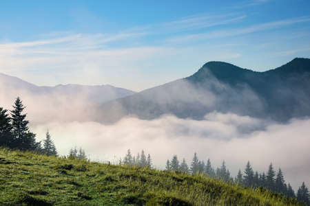 Beautiful view of mountains covered with fog at sunrise