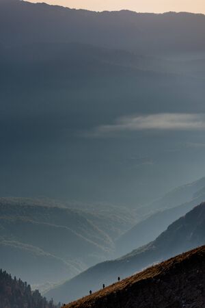Route through mountain peaks and hills through majestic landscapes. Active tourists, hiking, Caucasus Mountains Oshten Fisht. Sport lifestyle concept