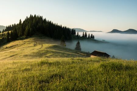 Beautiful summer morning in Carpathian Mountains. Mountains ranges are covered with a light mist. Pink clouds on the sky. Green meadow in foreground.