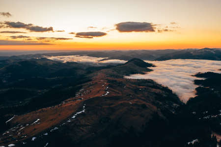 Morning in the mountains. Carpathian Ukraine, Aerial view.
