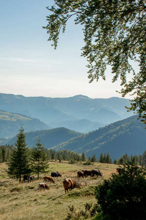 Cows graze on an alpine meadow among fir trees in the mountains. Mountains and slopes in the background. Mountain landscape with cows in the meadow.