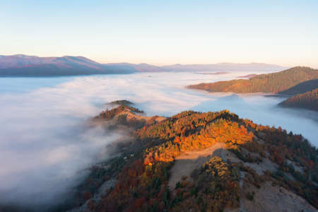 Beautiful landscape with thick mist and forest in mountains. Drone photography