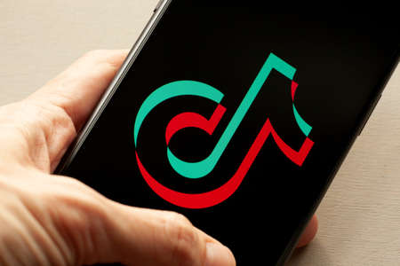 New York, United States: A woman holds a phone with the TIKTOK logo in her hand. It's one of the most popular social networks at the moment