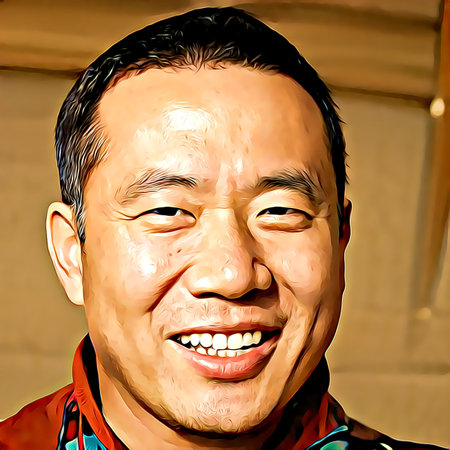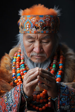 A traditional elderly Tibetan man 70 years old with a distinct features poses against a rustic background, reflecting his rich cultural identity and heritage. Wise serious direct gaze. Generative AI.