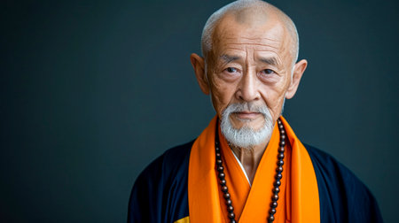 Elderly monk wearing traditional orange robe with calm expression and soft lighting on neutral background