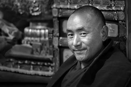 Portrait of tibetan monk with kind face, friendly smiling to camera