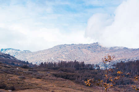 Top of the hill wrapped with the morning fog at Snow covered mountains. Beautiful Fog and white clouds over the mountain.