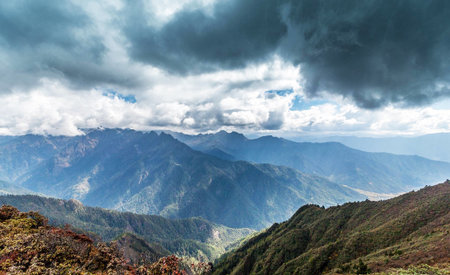himalayan snow cape mountains with dramatic sky at evening image is taken at tawang arunachal pradesh india.