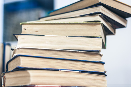 A stack of used books of different thicknesses on the shelf in the library, selective focus