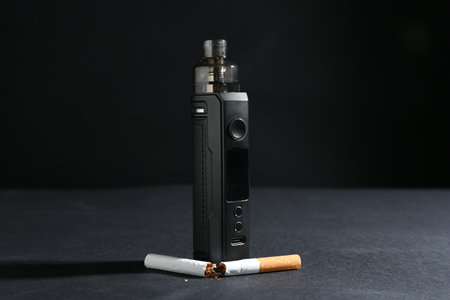 Electronic smoke device and cigarette on black background. Quit smoking concept.