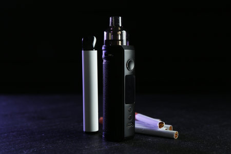 Electronic smoking devices and cigarettes on black table