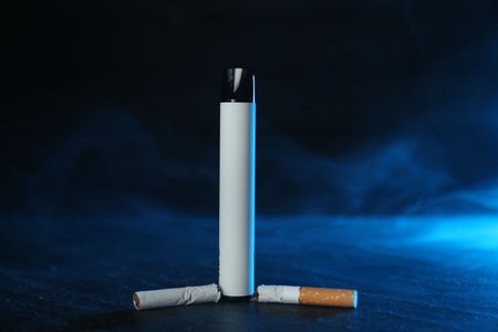 Electronic smoking device and broken cigarette on black table in blue light