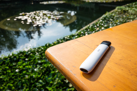 Electronic cigarette on a wooden table in a park close-up view