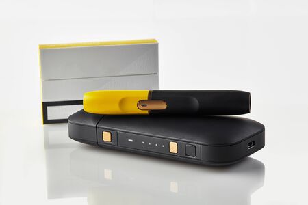 One pack, new generation black and yellow electronic cigarette is on battery, isolated on white. Hi-tech heating tobacco system. Advertising, close up