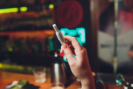 IQOS heat-not-burn tobacco product technology. Woman holding e-cigarette in his hand before smoking