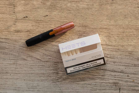 Ukraine, Dnipro - July 02, 2020. pack of cigarettes and iqos electronic cigarettes on a wooden table, addiction and bad habits
