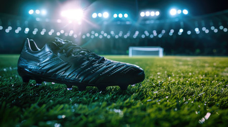 Professional soccer shoes cleans close-up on green grass with an outdoor stadium in the background. It's a great illustration for advertising or promotional materials.