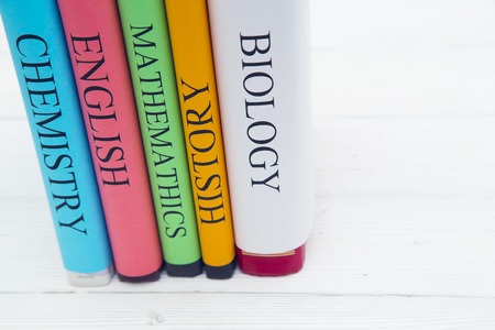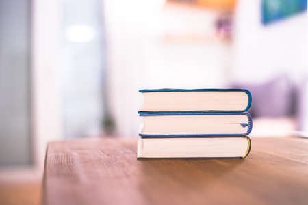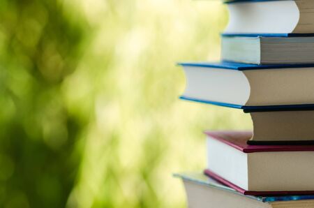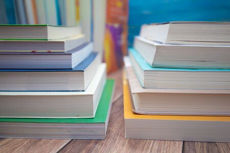 Close-up of book stack. Several colorful books with selective focus. Education concept