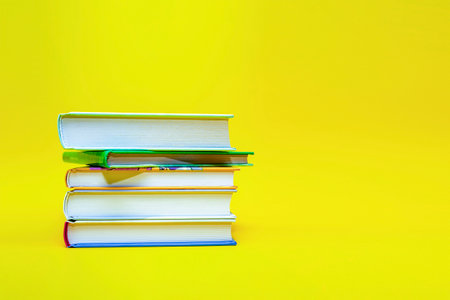 Stack of multicolored books on yellow surface background with copy space for text. Teacher's Day concept, Knowledge, literature ,reading, erudition concepts