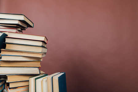 Stacks of books for teaching knowledge university library brown background