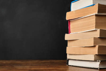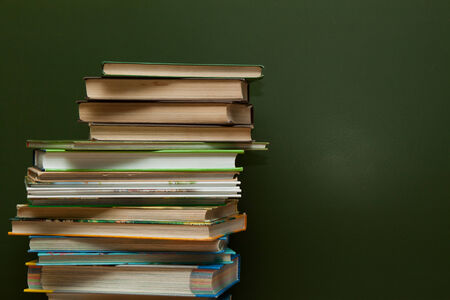 A large stack of different books on the surface. With a place for an inscription. The concept of education.