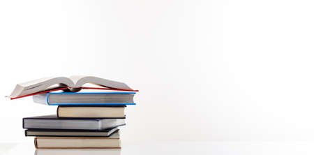 a stack of books with an open book, pages. Reading books, studying, learning, education concept, bookstore, researching