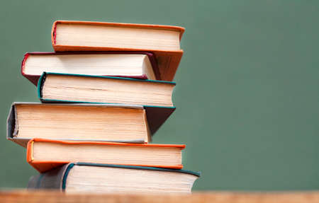 A pile of old, used text books stacked in a pile on a wooden desk in front of a black chalkboard. Copy space to left and above.