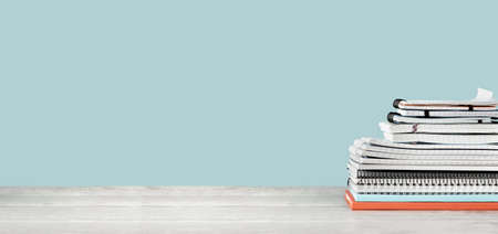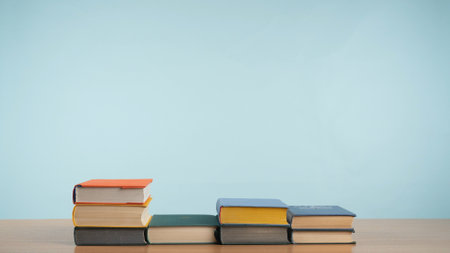 A tall stack of books stands on a wooden table against a light blue wall, free space for text