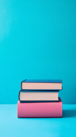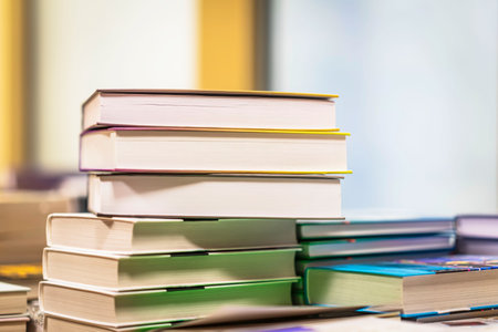 A vibrant arrangement of stacked books against a soft background, perfect for themes related to education, reading, knowledge, and creativity.